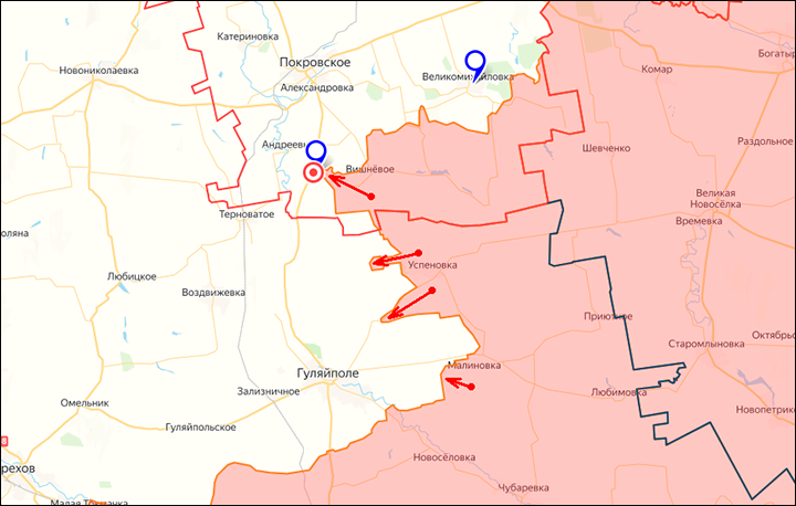 Продвижение оказалось столь существенным, что даже рутинно врущее о своих успехах украинское командование вынуждено было признать отход своих подразделений "на более выгодные рубежи обороны". В четверг успешное продавливание украинского фронта привело к "прострелу" его оборонительных порядков на узком участке: русские штурмовики взяли село Даниловка, физически перерезав трассу Гуляйполе – Покровское.