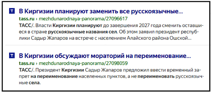Странные дела творятся в дружественной Киргизии: сначала президент Садыр Жапаров якобы анонсирует замену всех русскоязычных названий сёл до конца уже будущего года, а следом его пресс-секретарь это опровергает. О планах по завершению тотального переименования глава республики вроде бы заявил на встрече с жителями Алайского района Ошской области – его даже процитировали киргизские и русские СМИ, но вскоре сообщения с сайтов исчезли.