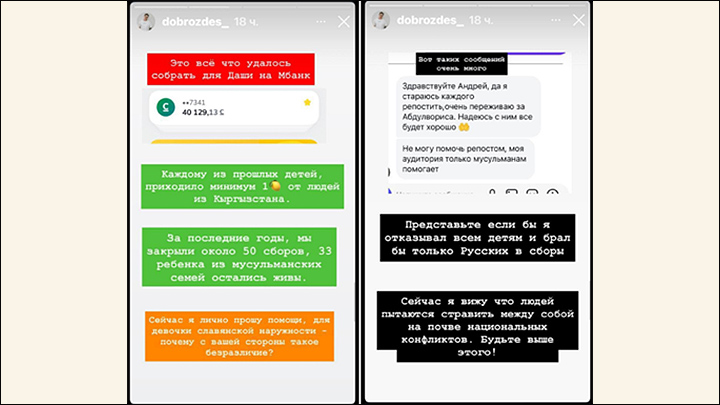 В то же время прогремела история, когда волонтёр Андрей Новиков пытался собрать деньги на лечение русской девочки в Киргизии. Но жертвователи, которые ранее помогали другим детям, отказались, потому что она... не мусульманка.