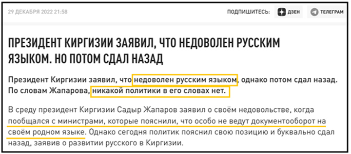 Сначала государственное информагентство России цитирует (!) прямую речь президента Киргизии, после чего удаляет сообщение и публикует уточнение – дескать, он говорил совсем не то, а переименование сёл с русскими названиями на повестке дня не стоит. Как понимать этот "переворот в воздухе" – трудности перевода?
