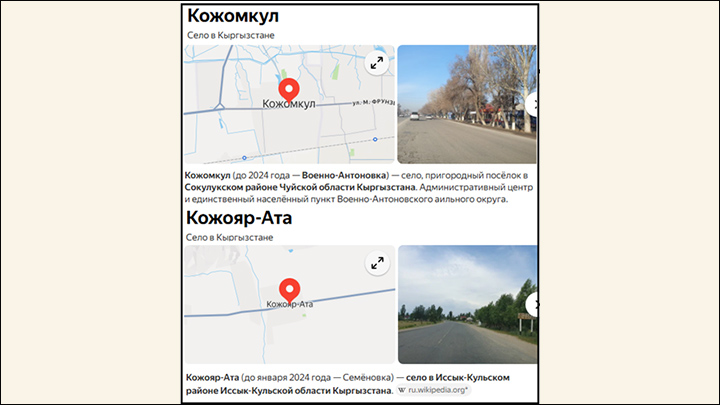 Борьба с русскими топонимами в Киргизии налицо/Скриншот из поисковика "Яндекс"