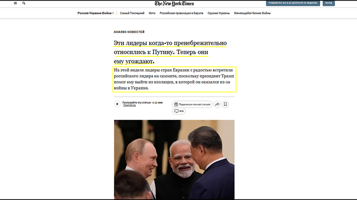 Сквозь зубы, но Запад вынужден признать: многополярный мир с центрами в России, Китае и Индии уже реальность. Скриншот: интернет-сайт nytimes.com (автоперевод)