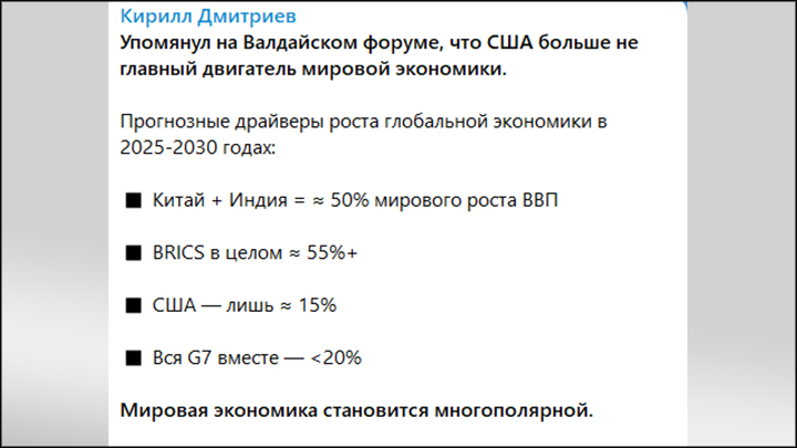 Что коллективный Запад во главе с США уже не является мировым гегемоном, свидетельствуют цифры. Так, в ходе Валдайского форума – 2025 председатель РФПИ Кирилл Дмитриев обратил внимание на прогнозы распределения долей в мировой экономике в ближайшие пять лет: