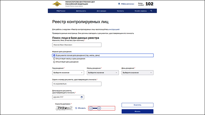 Реестр контролируемых лиц МВД России. Скриншот страницы сайта мвд.рф