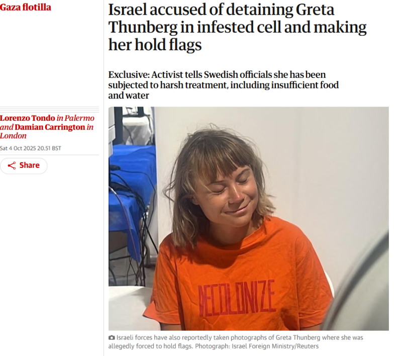 Газета The Guardian со ссылкой на чиновника шведского посольства, навестившего Тунберг в израильской тюрьме, пишет - девушка жалуется на издевательства.