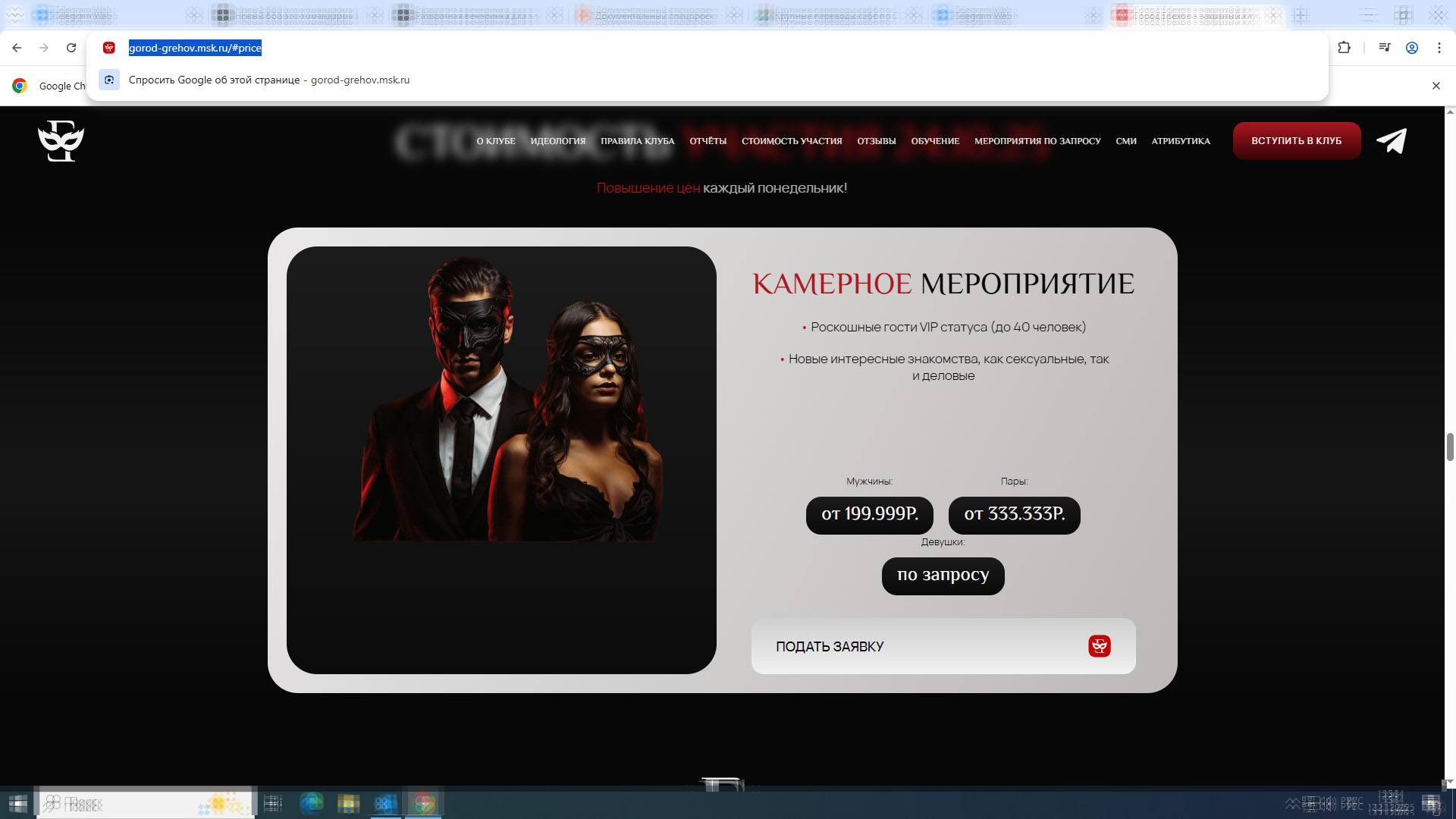 Сайт одной из подобных вечеринок. Билеты продаются открыто. Фото: Скриншот gorod-grehov.msk.ru/#price