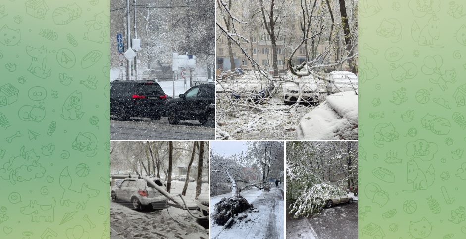В городах ситуация не лучше. В Москве на Профсоюзной улице и Зелёном проспекте тяжёлый мокрый снег начал валить деревья — повреждены минимум семь автомобилей, заблокированы выходы из подъездов.