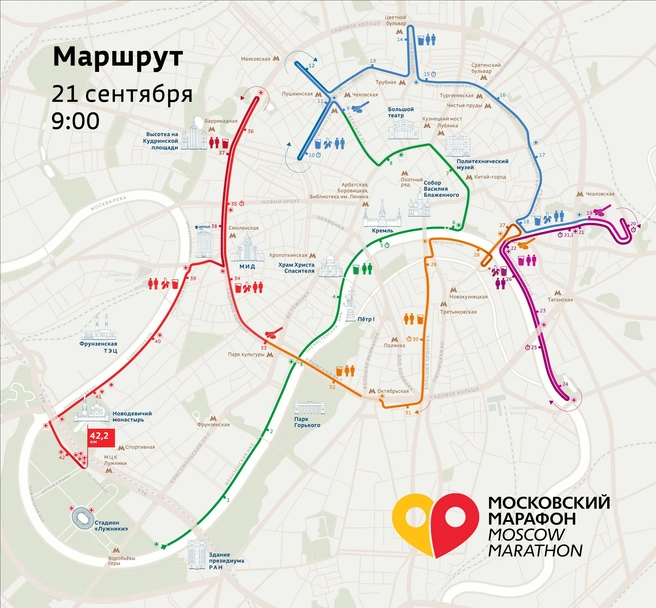 21 сентября пройдет основной забег по всему центру Москвы. Маршрут проходит мимо Кремля, храма Христа Спасителя и Большого театра. Старт забега состоится в 9:00. Награждение победителей — с 13:00 до 14:00. Ожидается, что в марафоне примут участие около 50 тысяч спортсменов из 65 стран.