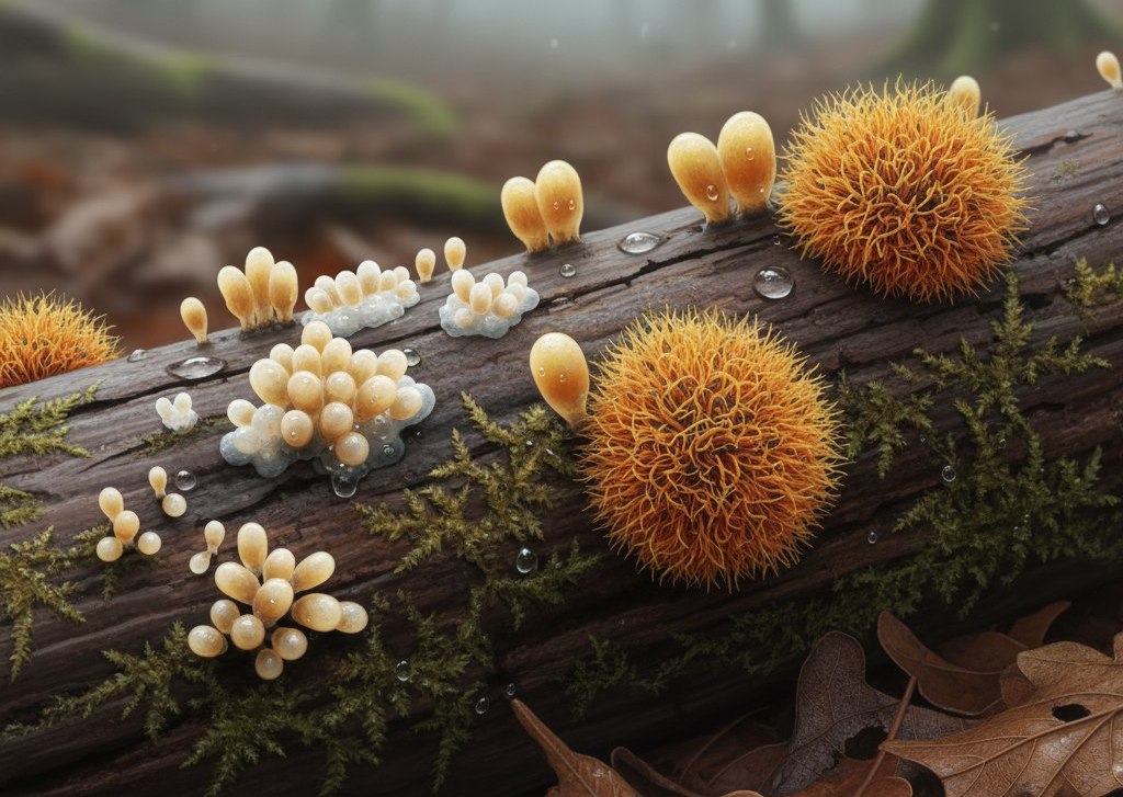 Ещё более странную группу составляют миксомицеты. В Московской области заметили трихию обманчивую, или, как говорят в народе, "ведьмина рвота". Она выглядит как скопление ярко-оранжевых, желеобразных капель, которые способны к медленному, почти незаметному скольжению по коре старых деревьев.