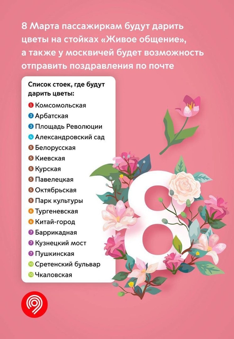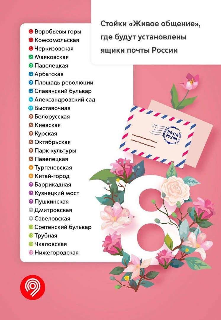 Также сотрудники метро помогут отправить бесплатные поздравительные открытки для любимых женщин по все стране. За доставку писем будет отвечать Почта России. Отослать поздравление можно будет в течение всего дня.