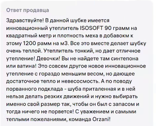 Больше всего возмущает реакция площадки и продавцов. Например, Алеся купила шубку "под леопарда" ценой почти 12000 рублей. Подкладка порвалась при первой носке, а утеплителя внутри и вовсе не оказалось. Почитайте этот шедевральный ответ на маркетплейсе!