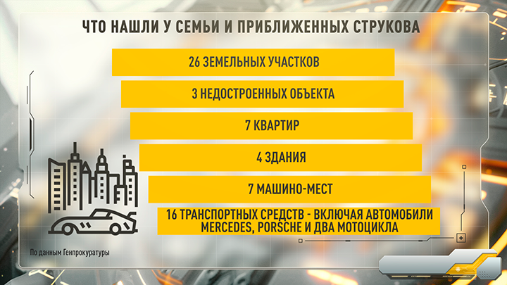 Также с бизнесмена взыскали 3,9 млрд рублей за экологический ущерб (в т. ч. из‑за прорыва дамбы на Светлинском месторождении). Генпрокуратура добилась конфискации имущества и денежных средств на общую сумму 4,9 млрд рублей у Струкова и его близких родственников.