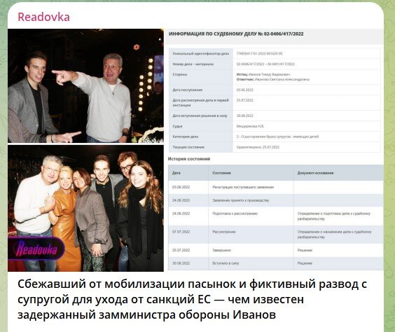 По ряду данных, Иванов и Захарова находятся в разводе. Его они оформили в 2022 году, после начала СВО. Не странно ли? Обычно такая практика используется, чтобы уберечь драгоценные активы за рубежом. Этот момент лучше оставить для следствия.